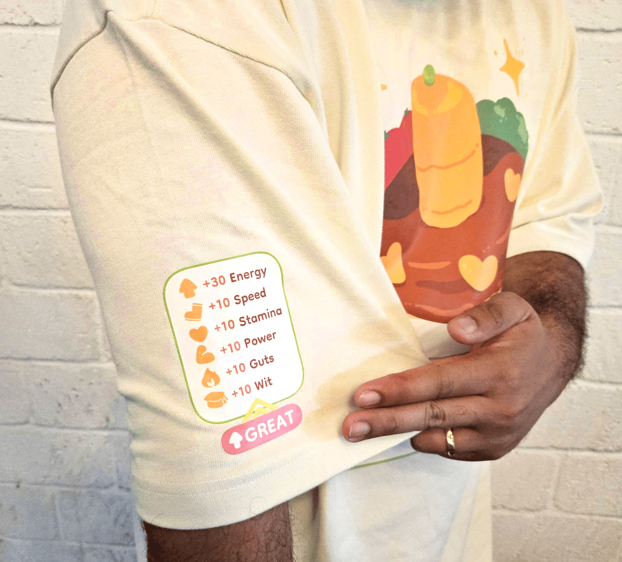You obtained: Deluxe Carrot Hamburger Steak! Each shirt also includes a sleeve detail of the stats you get from one! I wanted to design an inclusive shirt that would show that you like Umamusume, but in a more subtle way. Fun fact: my father-in-law likes this shirt.