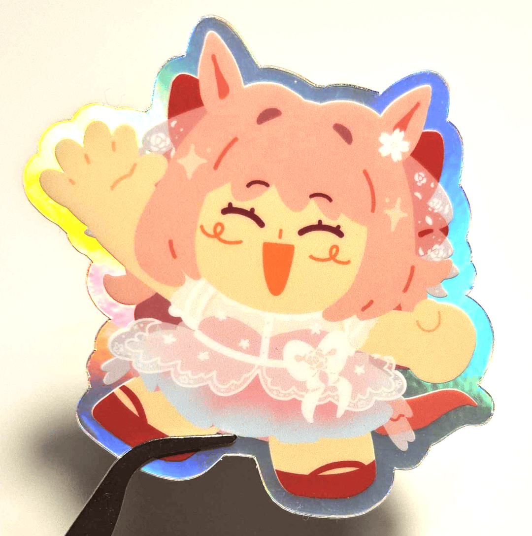 3in matte vinyl stickers. Each sticker has a clear border, except for Wedding Urara as she has a rainbow holograph border (see photos).